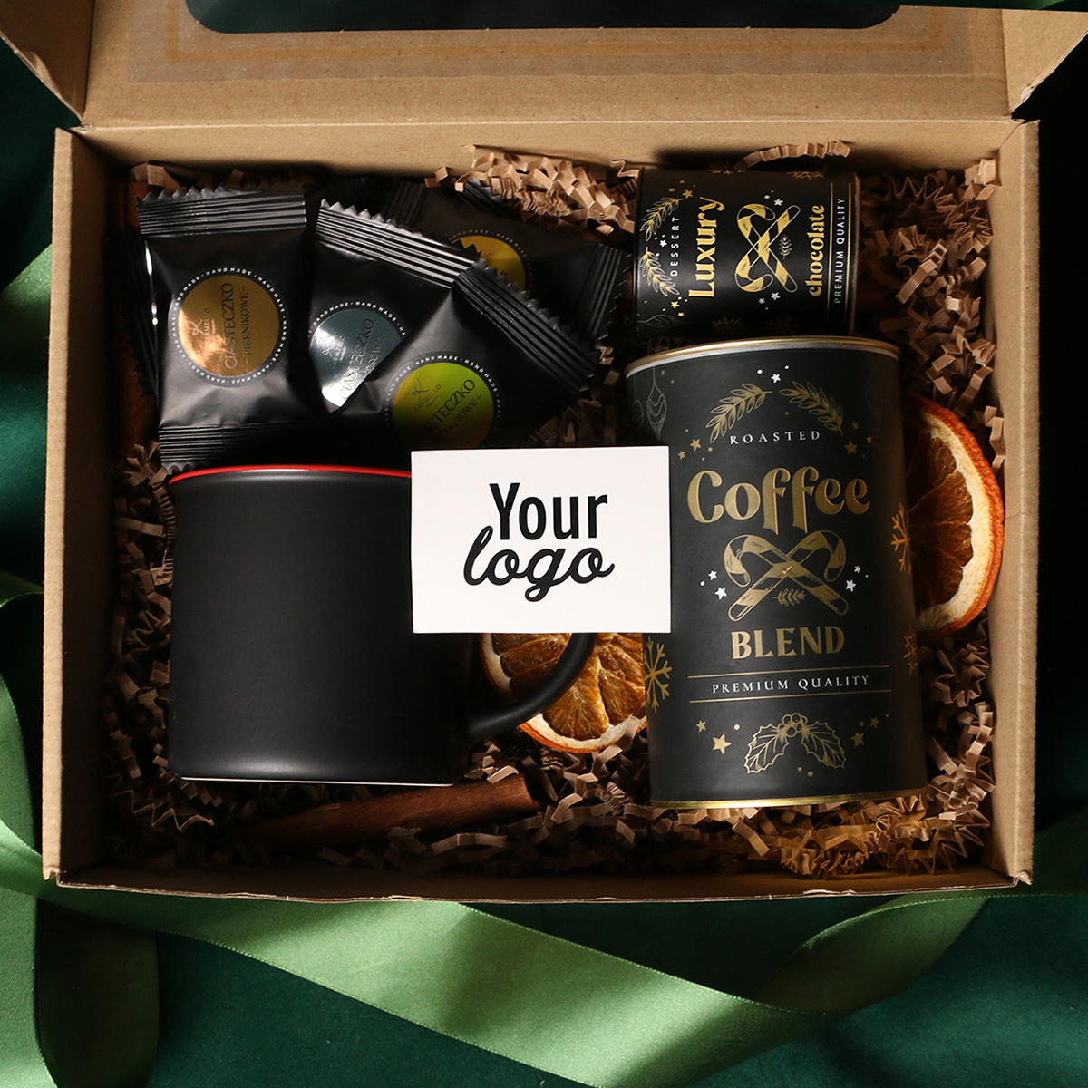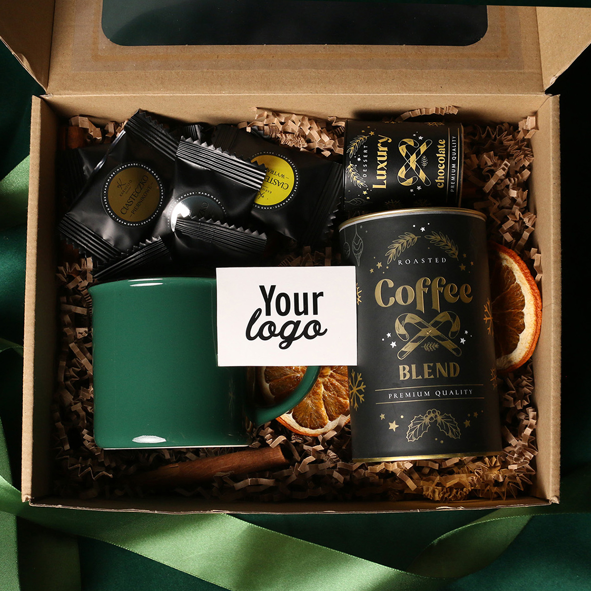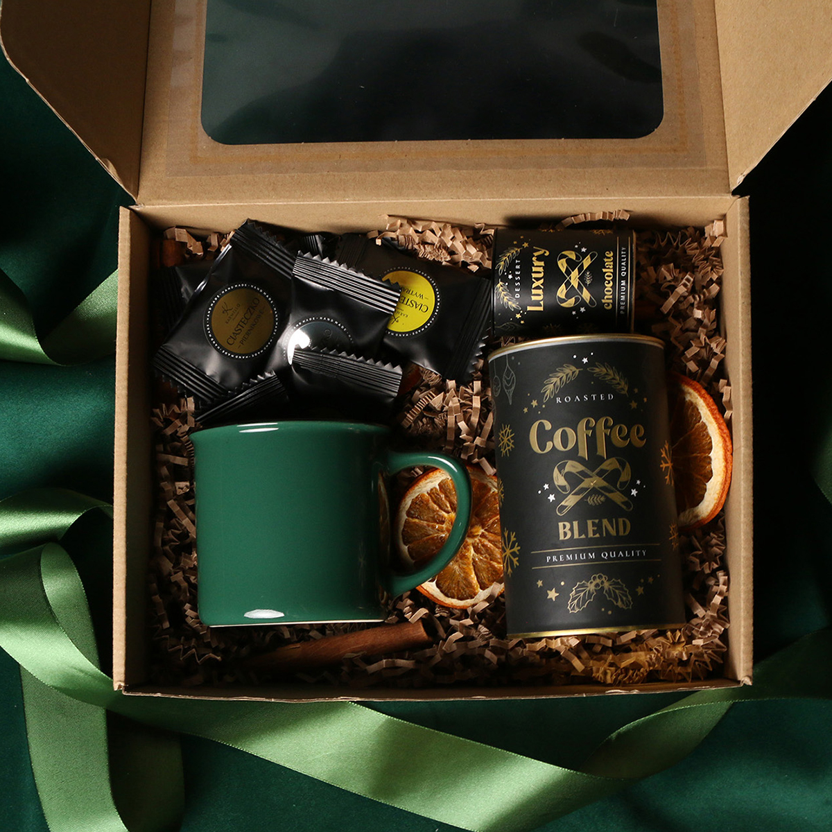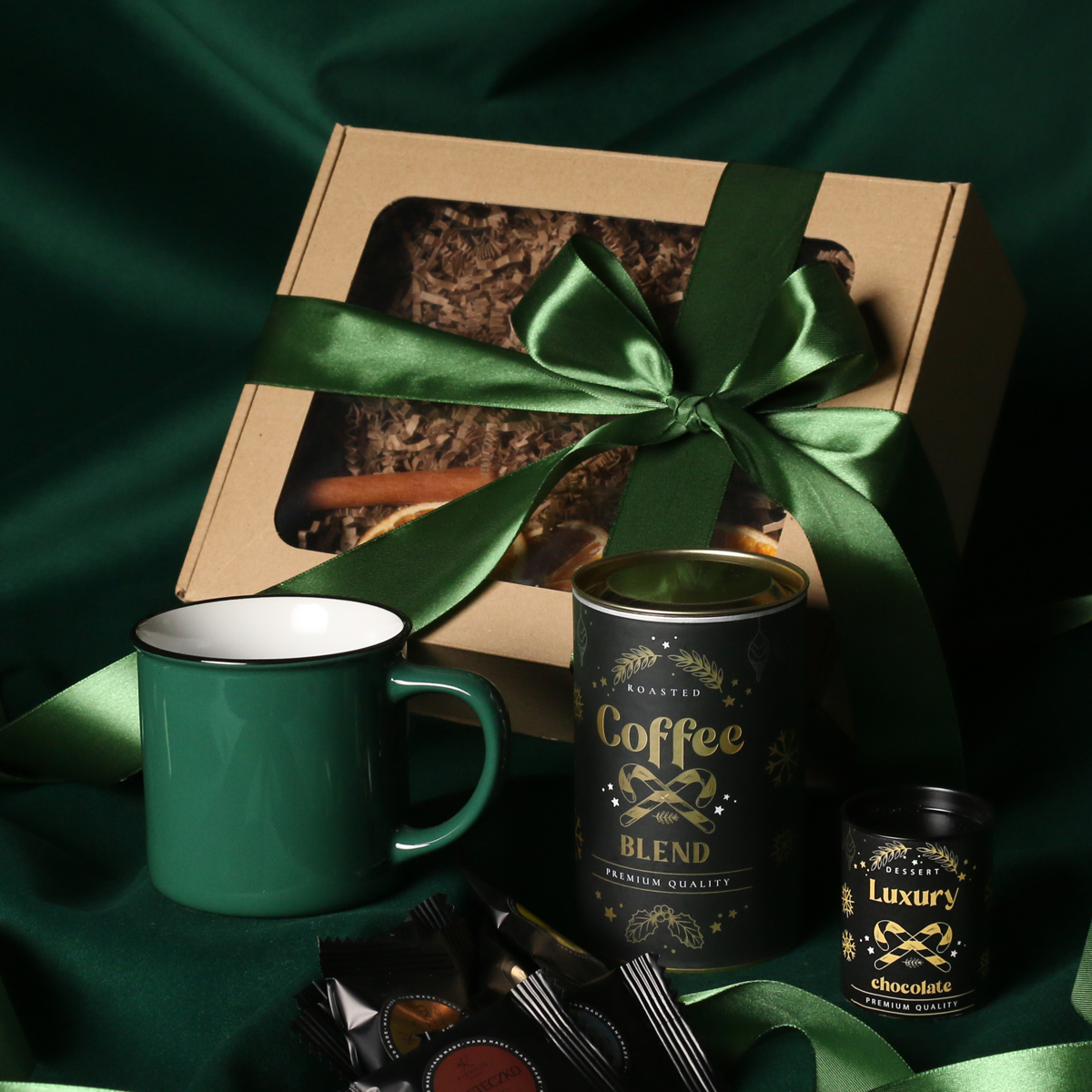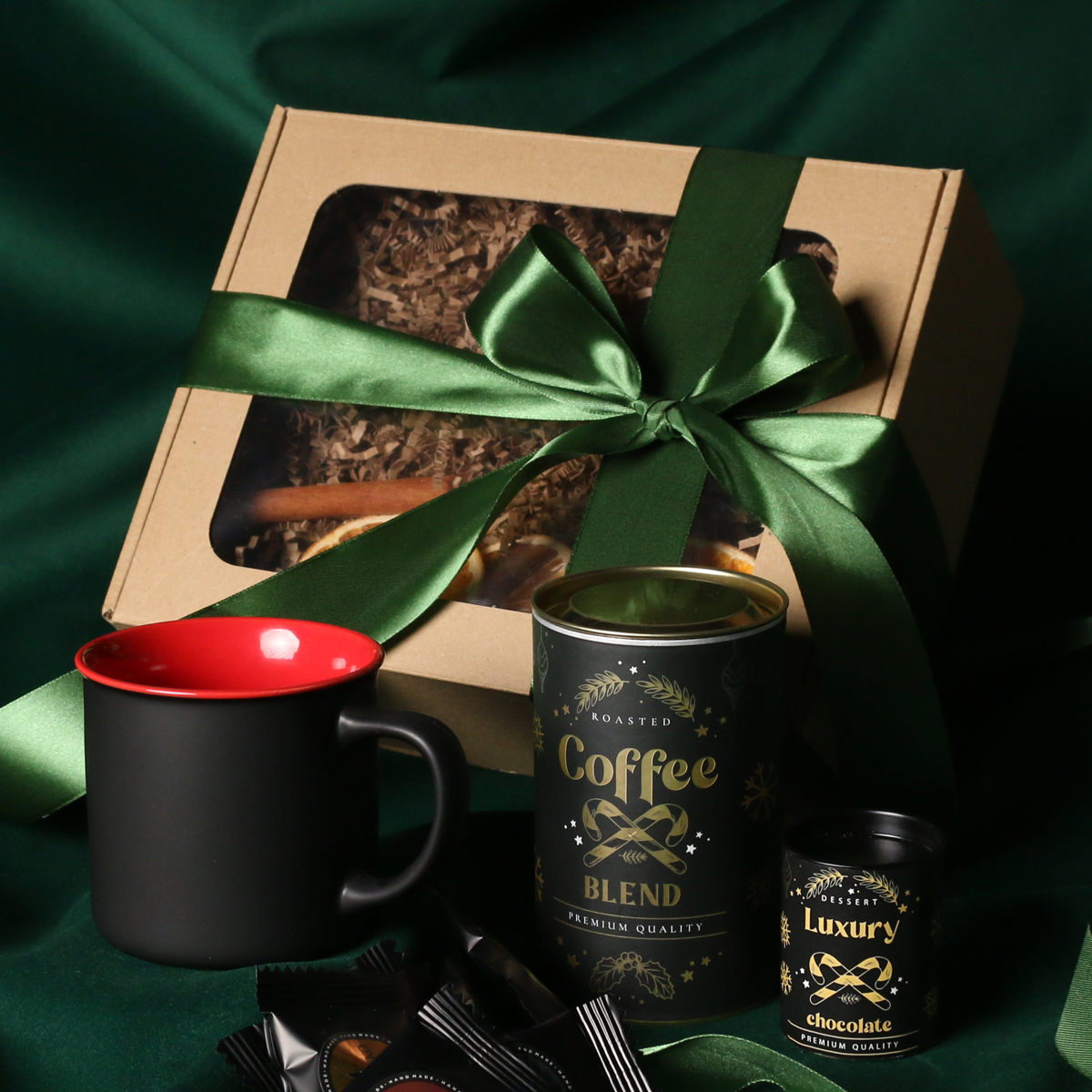 Kubek Loft w kolrze ciemnozielonym lub Loft Supreme w kolorze czerwonym i czarnym Rozgrzewająca belgijska czekolada do picia 40g Aromatyczna kawa ziarnista Arabica Brazil Cerrado Mineiro w puszce 150g Ekskluzywne ciasteczka studenckie 8 szt. - mix smaków Eleganckie dodatki zdobiące opakowanie: dopasowana kolorystycznie wstążka lub obwoluta
