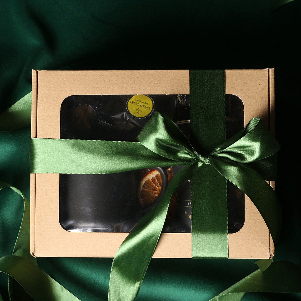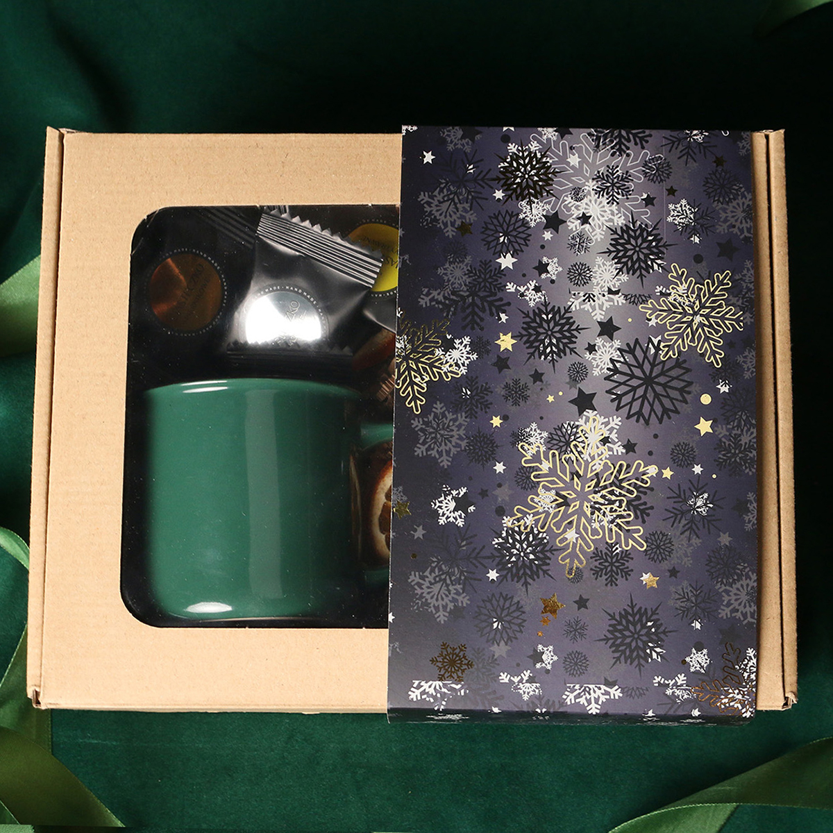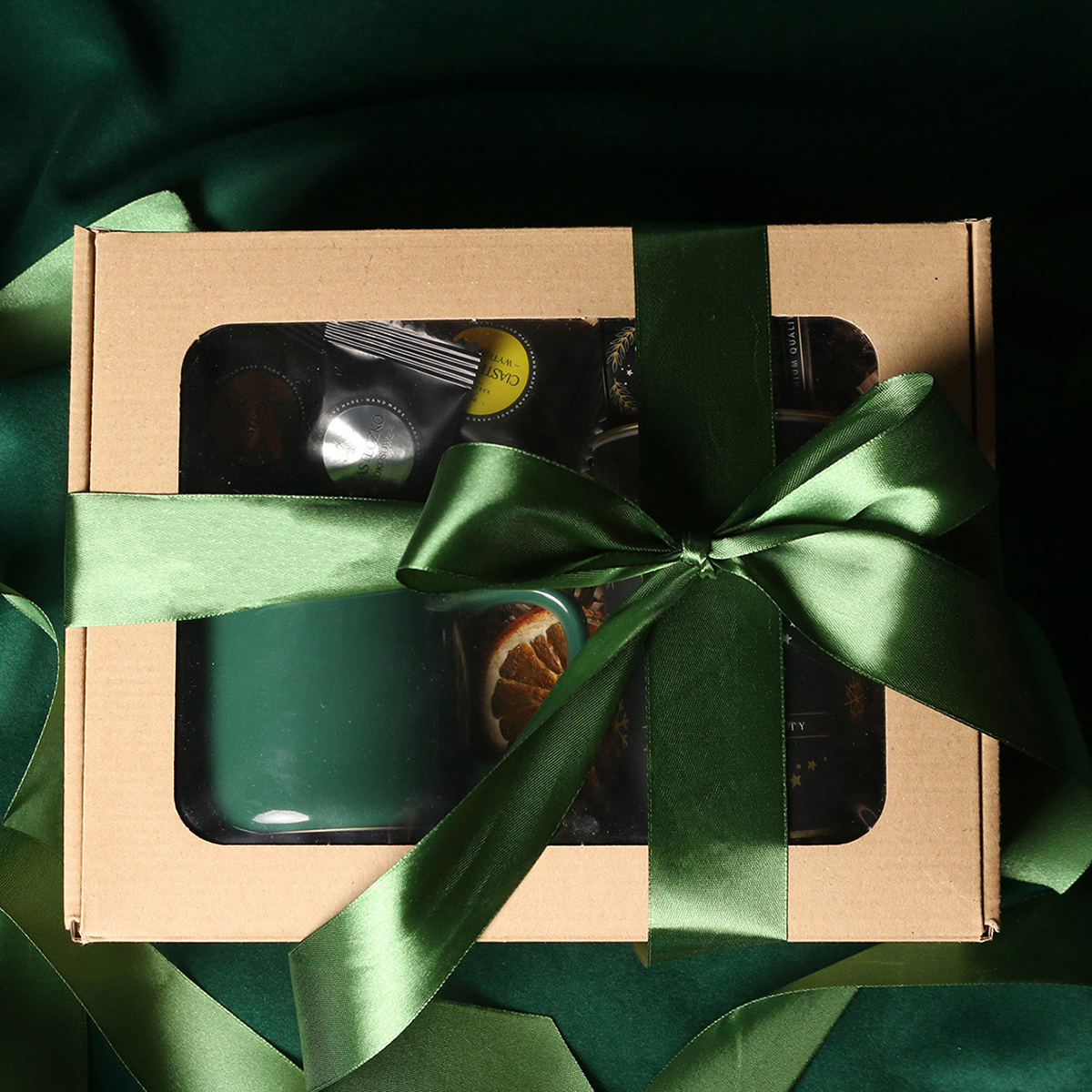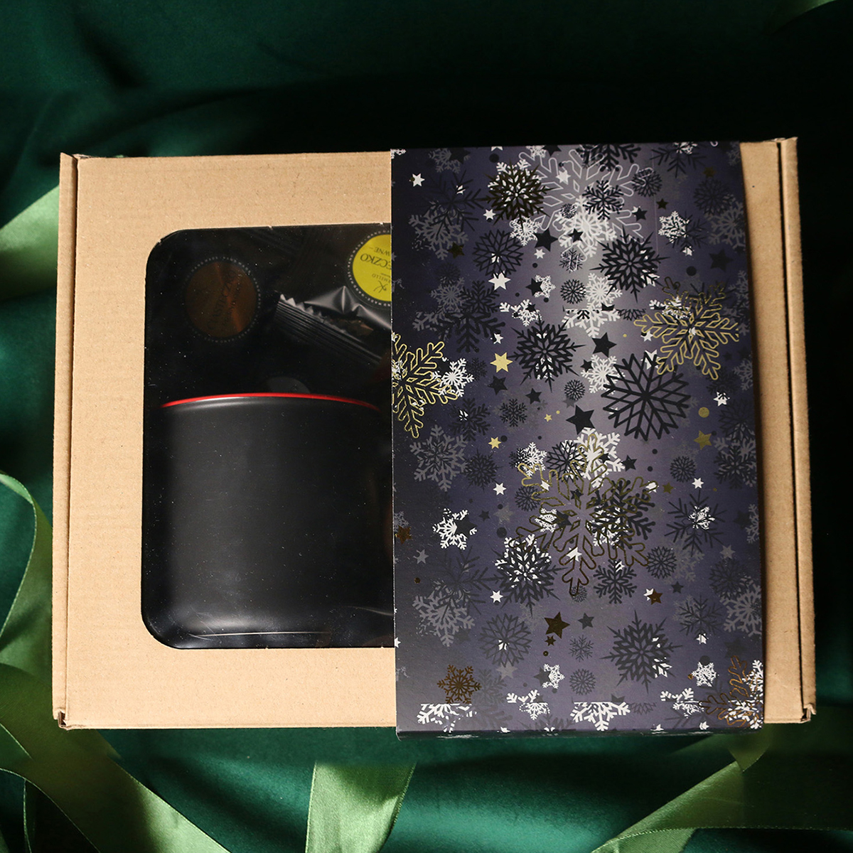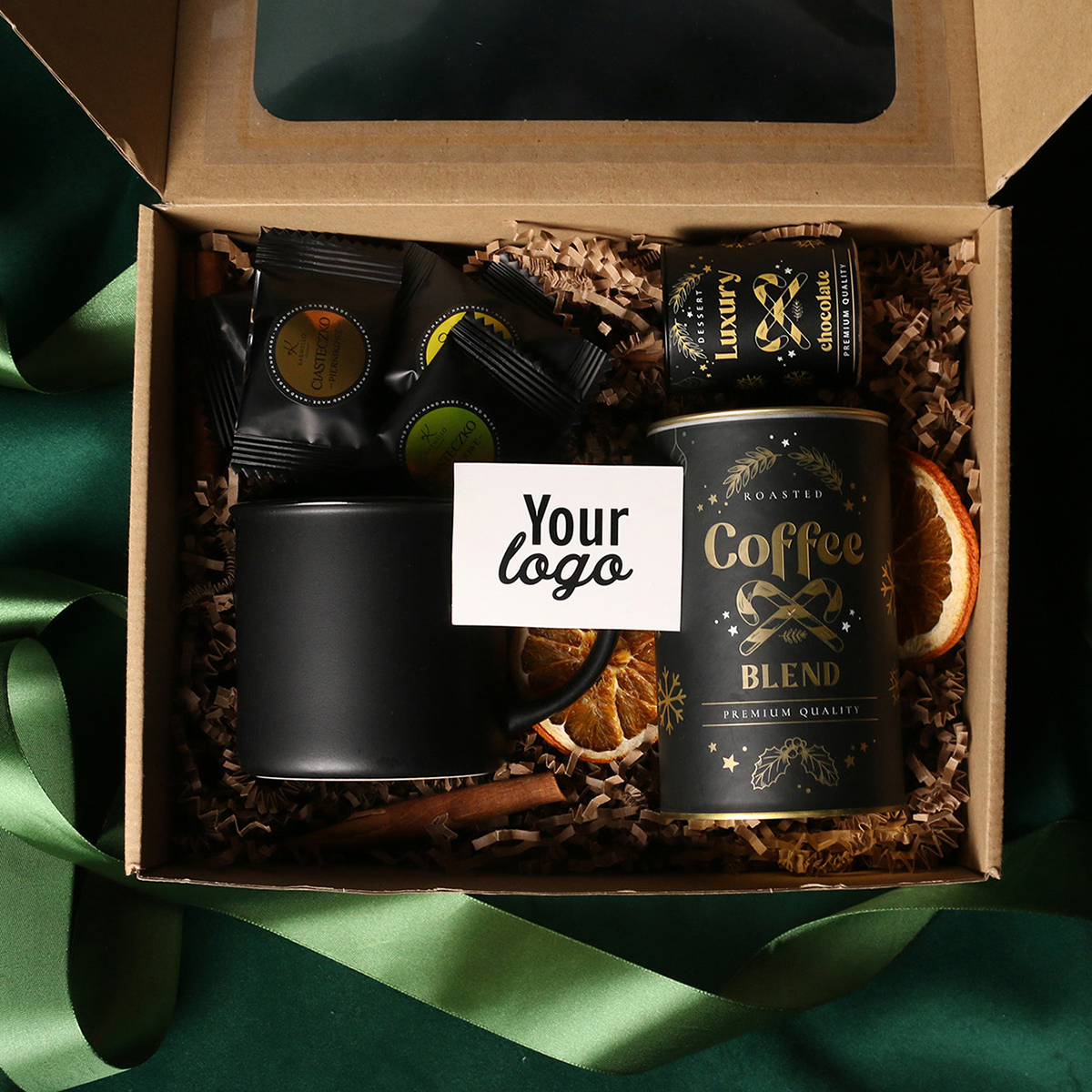 Kubek Loft w kolrze ciemnozielonym lub Loft Supreme w kolorze czerwonym i czarnym Rozgrzewająca belgijska czekolada do picia 40g Aromatyczna kawa ziarnista Arabica Brazil Cerrado Mineiro w puszce 150g Ekskluzywne ciasteczka studenckie 8 szt. - mix smaków Eleganckie dodatki zdobiące opakowanie: dopasowana kolorystycznie wstążka lub obwoluta